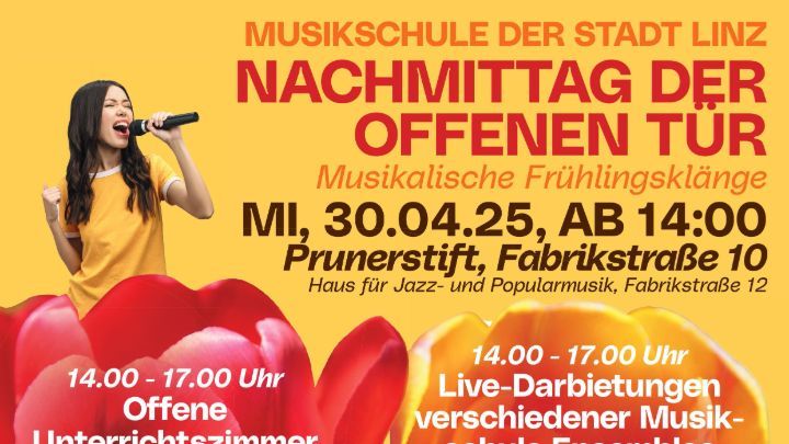 Nachmittag der offenen Tür Termin: 30.04.2025 Uhrzeit : 14:00 Uhr Veranstaltungsort: Musikschule der Stadt Linz Offener Unterricht, Live-Darbietungen und Elterninfo Mehr dazu 30.04.